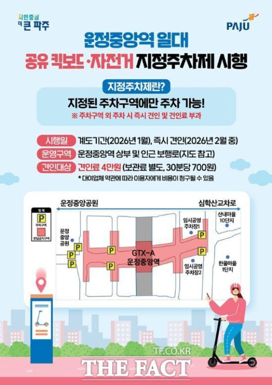 [더팩트ㅣ파주 =양규원 기자] 경기 파주시가 운정중앙역 일대의 보행자 안전을 확보하고 공유 이동장치의 무분별한 방치를 해소하기 위해 운정중앙역 상부와 인근 보행로를 대상으로 이달부터 '공유 이동장치 지정주차제'를 시행한다.