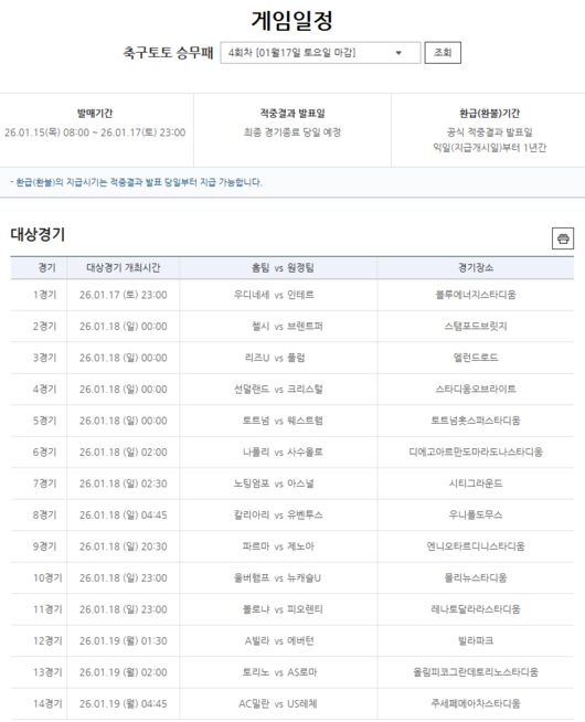 한편, 축구토토 승무패 4회차는 1월 15일(목) 오전 8시부터 17일(토) 오후 11시까지 발매가 진행된다.