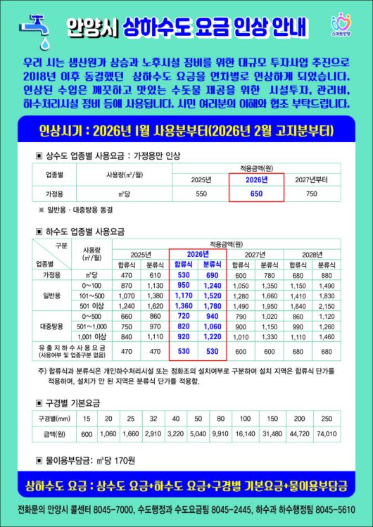 안양시는 상하수도 생산원가 상승과 노후 시설 정비를 위해 올해 2월 고지분부터 상하수도 요금을 인상한다고 밝혔다. 2018년 이후 상수도 요금을 동결해왔지만, 지난 2024년 상수도 시설 개선과 안전한 수돗물 공급을 위해 2025년부터 3년간 단계적 인상 계획을 세웠다.