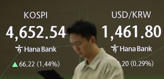 12일 서울 중구 하나은행 딜링룸 현황판에 코스피 지수와 원/달러 환율이 표시돼 있다. 이날 코스피 지수는 전 거래일보다 53.57포인트(1.17%) 오른 4639.89로 개장했다. [연합] |