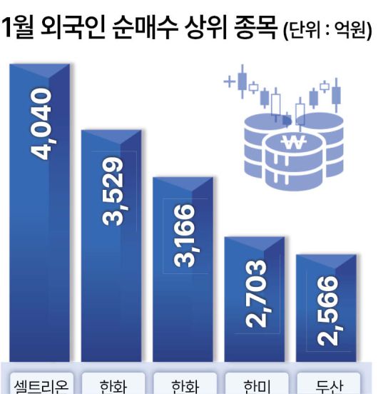 특히 주목되는 건 외국인 투자자가 순매수한 종목들이다. 새해 증시 상승을 견인한 것이 삼성전자와 SK하이닉스 등 반도체 대형주 ‘투톱’이었지만, 최근 외국인 투자자들이 선택한 종목은 반도체주가 아닌 바이오와 조선·방산·원전(조·방·원)’ 관련 종목인 것으로 나타났다.