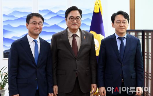 아시아투데이 송의주 기자 = 우원식 국회의장(가운데)이 12일 국회 의장실에서 더불어민주당 한병도 신임 원내대표(왼쪽), 천준호 원내운영수석부대표와 기념촬영을 하고 있다. ⓒ "젊은 파워, 모바일 넘버원 아시아투데이"