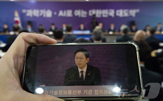 (서울=뉴스1) = 12일 오전 세종특별자치시 국가과학기술연구회에서 참석한 가운데 열린 '과학기술분야 출연연구기관 업무보고'에서 배경훈 부총리 겸 과학기술정보통신부 장관의 발언이 유튜브로 생중계 되고 있다. (과학기술정보통신부 제공. 재판매 및 DB 금지) 2026.1.12/뉴스1
