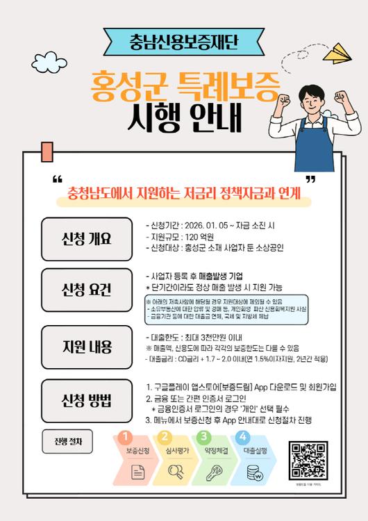 대상은 홍성군에 사업장을 두고 영업 중인 소상공인이며 업체당 보증 한도는 최대 3000만 원이다.