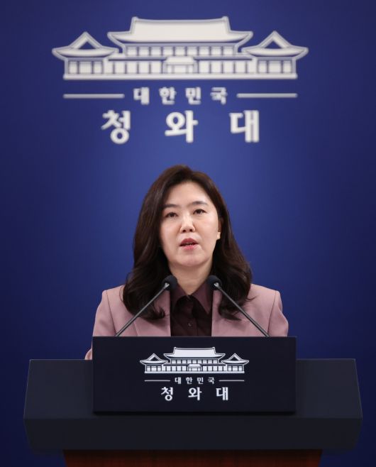 강유정 대변인이 12일 청와대 기자회견장에서 캄보디아 성착취 스캠(온라인 사기)조직원 검거관련 브리핑을 하고 있다. <연합뉴스> |