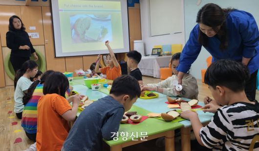 전북 익산시 인화동 남부시장 2층에 있는 공동육아나눔터 1호점에서 ‘영어와 함께하는 요리 활동’ 수업이 시작되자 5∼10세 아이 10명이 ‘개구리 햄버거’ 만들기에 열중하고 있다. 김창효 선임기자 |