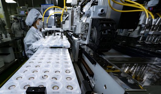 콘텍트렌즈 제조기업 네오비젼은 ‘AI비전 검사 시스템’을 통해 과거 육안 검사시절 1%에 달했던 불량률을 0.01%수준으로 대폭 줄였다. 사진은 지난달 24일 충북 청주시 네오비젼 오송공장에서 작업자가 AI 검사 장비를 이용해 제품을 살펴보고 있는 모습. 청주=임세준 기자 |