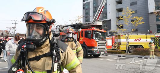 20일 전주시 덕진구 팔복LH아파트 및 더 메이호텔에서 행정안전부를 비롯한 전북소방본부, LH 등이 참여한 가운데 열린 유관기관합동 전기차 화재 대응 제4차 READY Korea 훈련에서 소방대원들이 부상자를 이송하고 있다.(기사 내용과 무관)2024.11.20/뉴스1 ⓒ News1 김기남 기자 |