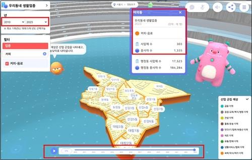(서울=연합뉴스) 황재하 기자 = 서울 각 지역의 사업체 분포와 밀집 업종, 지역 거주자의 평균소득과 소비 규모, 지난 10여년간 어떤 산업이 성장하거나 쇠퇴했는지 등을 한눈에 시각 데이터로 확인할 수 있게 된다.