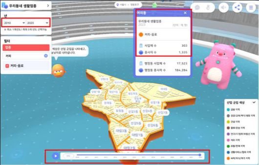 특히 426개 행정동 단위로 세분화된 데이터를 제공해 자치구 평균이 아닌 실제 생활권 수준의 경제 여건을 살펴볼 수 있다는 점이 특징이다. 핵심 기능 중 하나는 2010~2023년 사업체 조사 데이터를 바탕으로 서울 전역 산업구조 변화를 3차원으로 시각화한 것이다.