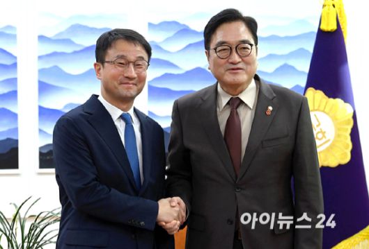 [아이뉴스24 곽영래 기자]한병도(왼쪽)더불어민주당신임원내대표가 12일 오전 국회의장을 예방, 기념사진을 찍고 있다.