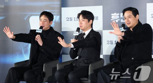 (서울=뉴스1) 권현진 기자 = 배우 조인성(왼쪽부터)과 박정민, 박해준이 12일 서울 광진구 롯데시네마 건대입구에서 열린 영화 '휴민트‘(감독 류승완) 제작보고회에 참석해 인사를 하고 있다. '휴민트'는 비밀도, 진실도 차가운 얼음 바다에 수장되는 블라디보스토크에서 서로 다른 목적을 가진 이들이 격돌하는 이야기를 그린 작품이다. 2026.1.12/뉴스1