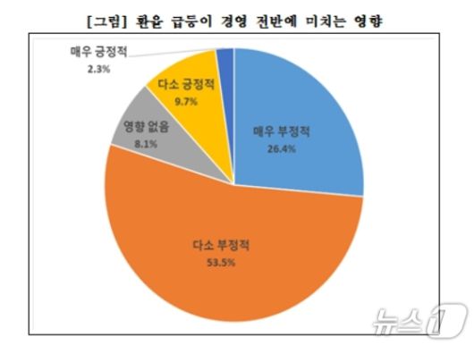 부정적인 영향을 받고 있는 요인으로는 '수입 원자재와 에너지 가격 상승'(85.4%), '물류 비용 증가'(60.2%), '외화 결제대금 환차손 발생'(19.9%), '원청기업 또는 해외 거래업체로부터 납품 단가 인하 압박'(15.5%), '외화 자산 및 부채 평가에 따른 환차손 발생'(9.7%) 등을 꼽았다.