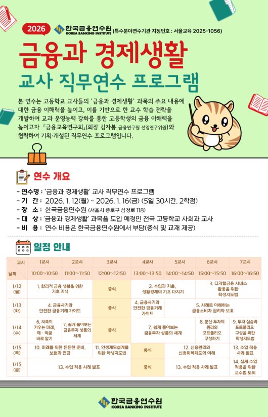 한국금융연수원은 12일부터 16일까지 5일간 '금융과 경제생활 교사 직무연수 프로그램'을 운영한다고 밝혔다. 이번 연수는 금융당국의 금융교육 강화 방침에 부응해 개설된 가정으로, 교육비는 전액 무료다. 전국 고등학교 사회과 교사 40명을 대상으로 선착순 접수 방식으로 진행되며, 총 30시간의 대면 연수로 구성됐다.