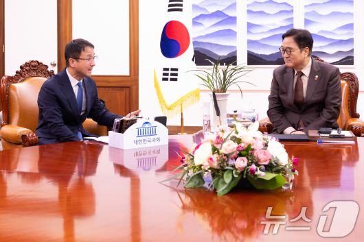 (서울=뉴스1) 유승관 기자 = 우원식 국회의장(오른쪽)이 12일 오전 서울 여의도 국회 의장실에서 한병도 더불어민주당 신임 원내대표를 접견하고 있다. (공동취재) 2026.1.12/뉴스1fotogyoo@news1.krCopyright ⓒ 뉴스1. All rights reserved. 무단 전재 및 재배포, AI학습 이용 금지.