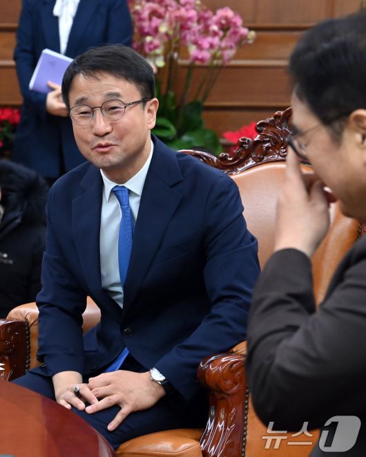 (서울=뉴스1) 유승관 기자 = 한병도 더불어민주당 신임원내대표가 12일 서울 여의도 국회에서 우원식 국회의장을 예방하고 있다. (공동취재) 2026.1.12/뉴스1fotogyoo@news1.krCopyright ⓒ 뉴스1. All rights reserved. 무단 전재 및 재배포, AI학습 이용 금지.