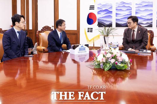 [더팩트ㅣ국회=배정한 기자] 한병도 더불어민주당 신임 원내대표(왼쪽)가 12일 오전 서울 여의도 국회에서 우원식 국회의장을 예방하며 기념사진 촬영을 하고 있다. 오른쪽은 천준호 원내운영수석부대표.