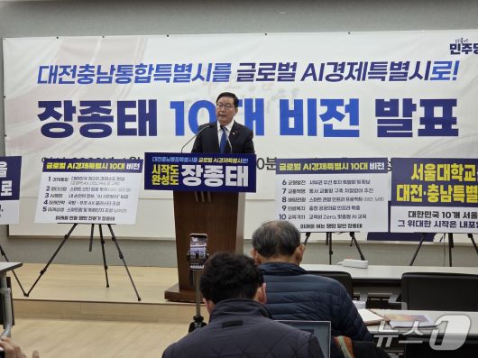 (내포=뉴스1) 김낙희 기자 = 대전·충남 통합시장 출마를 공식화한 장종태 민주당 의원(72·대전 서구갑)이 12일 충남도청 프레스센터에서 기자회견을 열어 "글로벌 AI 경제특별시 10대 비전'을 발표하며 "충남의 제조업과 대전의 첨단 AI 기술을 결합해 대전·충남 통합 특별시를 글로벌 AI 경제특별시로 만들겠다"고 밝혔다.