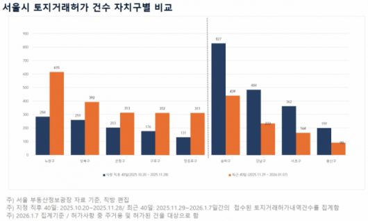 서울시 자치구별로는 기존 토지거래허가구역 지역과 신규로 지정된 지역 간 상반된 흐름을 보였다. 기존 토허제 지역인 △송파(827건→439건) △강남(484건→233건) △서초(362건→164건) △용산(199건→90건) 등은 접수건수가 오히려 줄어든 반면 △노원(284건→615건) △성북(259건→392건) △은평(203건→313건) △구로(176건→312건) △영등포(131건→311건) 등 신규 규제 지역에서는 허가 건수 증가세가 두드러졌다.