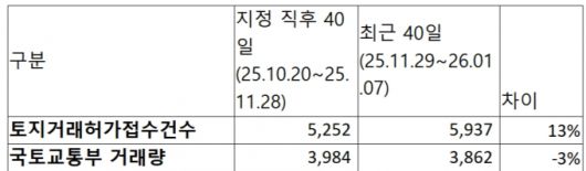 토지거래허가구역 내 거래는 허가 이후 실제 계약까지 일정 시차가 발생하는 만큼 이번 분석은 실거래량 대신 허가 건수를 기준으로 삼았다. 다만 허가 건수가 늘었어도 계약 철회·취소 등으로 실제 거래량 확대까지 이어지지 않을 수 있다. 같은 기간 서울시 아파트 매매 실거래량은 3984건에서 3862건으로 3%가량 감소했다.