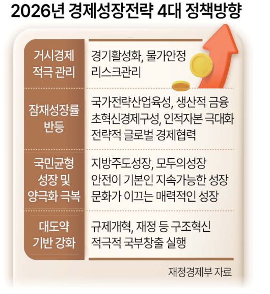 정부가 2026년 경제성장전략을 통해 올해 국내총생산(GDP) 성장률을 2.0%로 제시하며 저성장 탈출을 선언했다. 이는 한국은행, 한국개발연구원(KDI), 국제통화기금(IMF) 등 국내외 주요 기관이 전망한 1.7~1.9%를 웃도는 수치다.