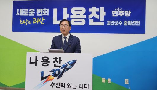 나용찬 전 괴산군수가 12일 군청 브리핑룸에서 기자회견을 열어 괴산군수 선거 출마를 공식 선언하고 "괴산을 새롭게, 군민을 기쁘게 하겠다"며 "현장에서 답을 찾는 '만나기 쉬운 군수'가 되겠다"고 밝혔다.
