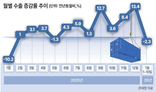 인공지능(AI) 수요 확대에 힘입어 1월 1∼10일 반도체 수출이 전년 동기 대비 45% 넘게 늘며 전체 수출의 30%를 떠받쳤다. 그러나 조업일수 감소와 자동차·철강 등 주력 품목 부진이 겹치면서 같은 기간 전체 수출은 2% 가량 감소했다.