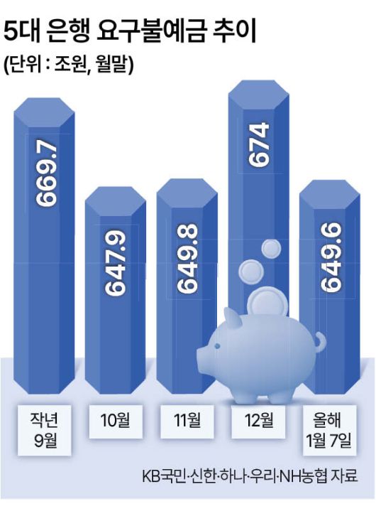 12일 금융권에 따르면 7일 기준 5대 은행(KB국민·신한·하나·우리·NH농협)의 수시입출금식예금(MMDA)을 포함한 요구불예금은 총 649조6311억원으로 집계됐다. 이는 지난해 말(674조84억원)과 비교해 24조3773억원 감소한 규모다. 불과 일주일 사이 24조원이 넘는 돈이 빠져나갔다. 이는 코스피 지수가 사상 처음으로 4000선을 넘어서면서 예치금이 급감한 지난해 10월 한 달 감소 폭(약 22조원)보다 더 큰 규모다. 요구불예금은 수시입출식 예금이나 급여통장처럼 언제든 인출이 가능한 자금이다.