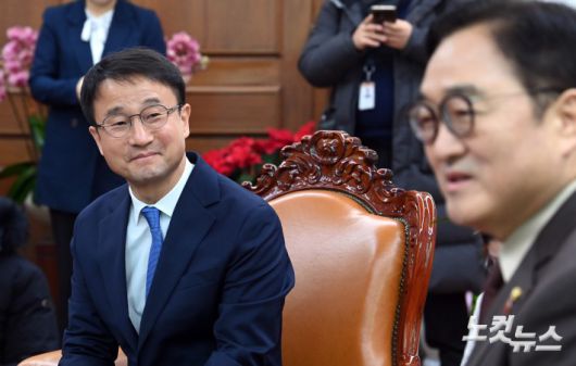더불어민주당 한병도 신임 원내대표가 12일 서울 여의도 국회에서 우원식 국회의장을 예방하고 있다.
