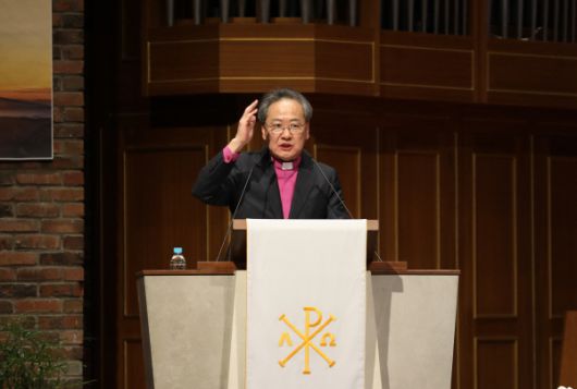 평신도단체 신년감사예베서 설교하는 기독교대한감리회 김정석 감독회장./제공=감리교 |