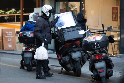 한 배달원이 서울 시내에서 점심시간 음식을 배달하고 있다./뉴스1 |