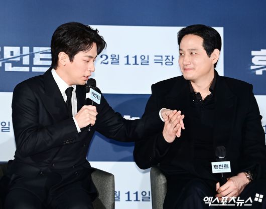 (엑스포츠뉴스 박지영 기자) 12일 오전 서울 자양동 롯데시네마 건대입구점에서 영화 '휴민트' 제작보고회가 진행됐다. 이날 행사에 참석한 배우 박정민, 박해준이 이야기를 나누고 있다. 박지영 기자 jypark@xportsnews.com