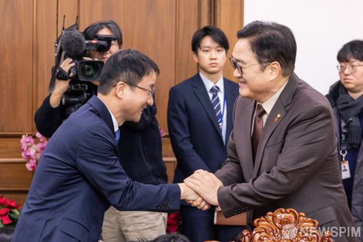 [서울=뉴스핌] 정일구 기자 = 우원식 국회의장(오른쪽)이 12일 오전 서울 여의도 국회 의장실에서 한병도 더불어민주당 신임 원내대표와 악수하고 있다. 2026.01.12 mironj19@newspim.com |
