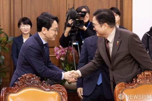 [서울=뉴스핌] 정일구 기자 = 우원식 국회의장(오른쪽)이 12일 오전 서울 여의도 국회 의장실에서 천준호 더불어민주당 원내운영수석부대표와 악수하고 있다. 2026.01.12 mironj19@newspim.com