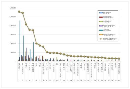 IT서비스 상장기업 브랜드평판 분석은 참여지수, 미디어지수, 소통지수, 커뮤니티지수, 시장지수, 사회공헌지수로 구분해 브랜드평판지수를 산출했다.