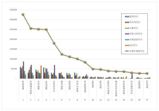 3위 교보생명 브랜드는 참여지수 466,178, 미디어지수 356,456, 소통지수 428,403, 커뮤니티지수 303,970, 사회공헌지수 293,693, CEO지수 672,846이 되면서 브랜드평판지수 2,521,546으로 분석됐다. 지난 12월 브랜드평판지수 2,523,502와 비교해보면 0.08% 하락했다.