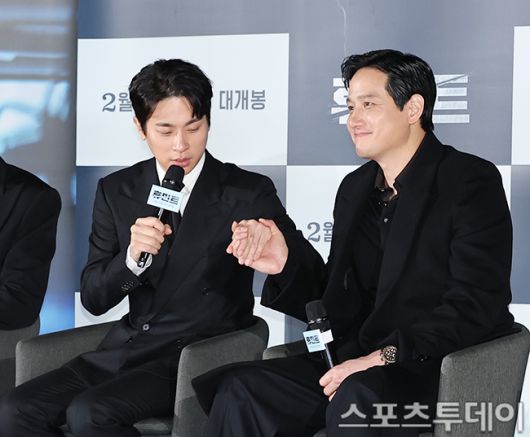 [스포츠투데이 권광일 기자] 배우 박정민, 박해준이 12일 오전 서울 광진구 자양동 롯데시네마 건대입구점에서 열린 영화 '휴민트' 제작보고회에 참석해 포즈를 취하고 있다. 2026.01.12.