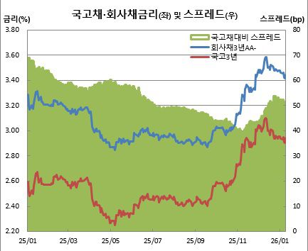 연초를 맞아 크레딧시장에 온기가 퍼지고 있다. 연말 국고채 지표물 교체와 유동성 위축 이슈로 확대됐던 회사채 스프레드가 연초 자금유입 효과와 우량물 발행 강세 등에 힘입어 다시 좁혀지고 있기 때문이다. 현재 50bp초반 수준인 AA-등급 회사채 3년물 기준 스프레드가 40bp 초중반까지 줄어들 수 있다는 전망에 힘이 실리고 있다.