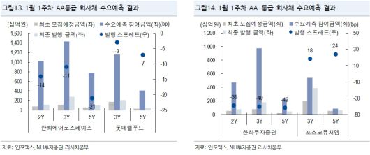 이승재 iM증권 크레딧채권 애널리스트도 “작년 12월 거래대금 감소와 국고채 지표물 교체로 스프레드 왜곡이 컸었다. 연초들어 거래가 회복되고 우량등급 회사채들이 언더로 발행되면서 투자심리가 나쁘지 않다”며 “국고채 3년물 금리가 2.9%대 초반까지 내려오면서 금리 안정 기대가 커진 점도 회사채 수요예측을 자극하고 있다”고 말했다.