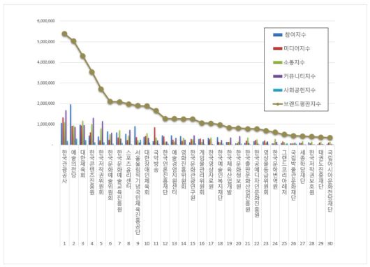 문화체육관광부 공공기관 브랜드평판 분석은 참여지수, 미디어지수, 소통지수, 커뮤니티지수, 사회공헌지수로 구분해 브랜드평판지수를 산출했다.