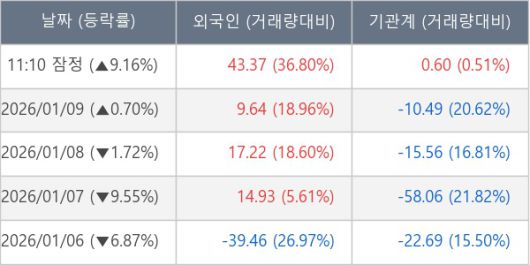 [서울=뉴스핌] 로보뉴스 = 12일 11시 30분 현재 심텍(222800)은 외국인과 기관이 각각 43.37 만 주, 0.60 만 주 순매수(잠정) 하면서 전일 대비 9.16% (현재가 47,050원) 상승하고 있다.