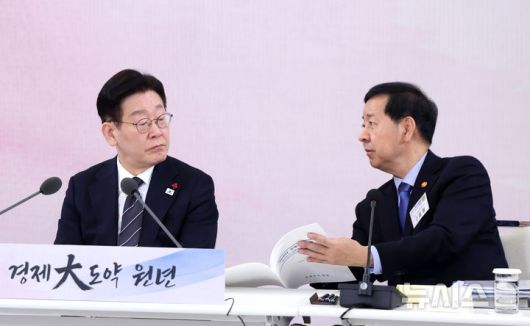 [서울=뉴시스] 최동준 기자 = 이재명 대통령이 9일 청와대에서 열린 경제성장전략 국민보고회에서 구윤철 부총리와 자료를 보며 이야기를 나누고 있다. (청와대통신사진기자단) 2026.01.09. photocdj@newsis.com |