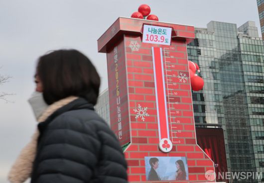 [서울=뉴스핌] 이길동 기자 = 12일 서울 종로구 광화문 광장에 설치된 사랑의 온도탑 나눔온도가 103.9도를 가리키고 있다. 사랑의열매 사회복지공동모금회는 이날 '희망 2026 나눔 캠페인'의 사랑의 온도탑 나눔 온도가 100도를 돌파했다고 밝혔다. 11일 자정까지 사랑의 열매를 통해 모두 4,676억 원이 모금돼 목표액인 4,500억 원의 103.9%를 기록했다. 2026.01.12 gdlee@newspim.com