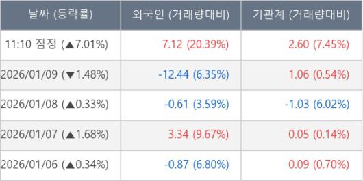 [서울=뉴스핌] 로보뉴스 = 12일 11시 30분 현재 아이텍(119830)은 외국인과 기관이 각각 7.12 만 주, 2.60 만 주 순매수(잠정) 하면서 전일 대비 7.01% (현재가 6,410원) 상승하고 있다.