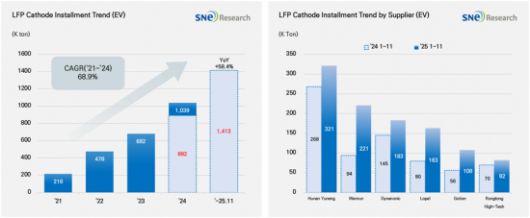 12일 이차전지 시장 조사 업체 SNE리서치에 따르면 2025년 1~11월 전 세계 전기차(순수전기차·플러그인하이브리드차·하이브리드차) 에 투입된 양극재의 총적재량은 2316킬로톤(Kton)으로 전년 같은 기간보다 36.7% 증가했다.