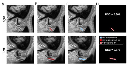 그 결과, 전문가가 수동으로 표시한 영역과 AI가 자동으로 분할한 영역의 일치 정도를 측정하는 DSC(Dice 유사도 계수, 1에 가까울수록 유사) 값이 두 차례의 검증에서 0.734, 0.714로 나타났다. 이는 AI가 찾아낸 영역이 전문가의 판단과 70% 이상 부합한다는 뜻으로, 의료영상 분야에서 높은 수준으로 인정받는다.