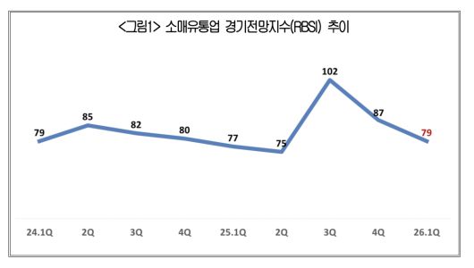 대한상공회의소가 12일 발표한 ‘2026년 1분기 소매유통업 경기전망지수(RBSI)’ 조사 결과, 전망치가 ‘79’를 기록했다.