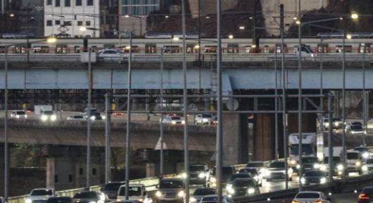 지난 2일 서울 성동구 동호대교 인근에서 출근 시간대 지하철과 차가 달리는 모습. |