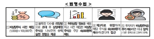 이후 매수를 권유하는 비상장주식에 대해 ‘상장 임박’, ‘상장 시 수배 수익’, ‘상장 실패 시 재매입 및 원금 보장’ 등 고수익 실현과 투자 위험이 최소화된 안정적인 투자라며 기대심리를 자극했다. 동시에 블로그·인터넷 신문사 등에 조작된 기업설명(IR) 자료와 허위 상장 정보를 대량 게재하면서 투자자들을 현혹했다. 불법업체는 제 3자의 투자자 또는 대주주로 위장·접근해 주식 물량을 확보 중이며 충분한 물량이 확보되면 고가에 매입하겠다며 거액의 재투자를 유도하기도 했다.
