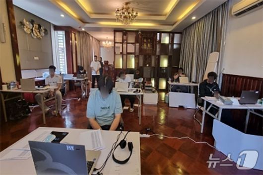 (서울=뉴스1) 이재명 기자 = 청와대는 12일 캄보디아 거점 성 착취 스캠범죄 조직원 26명을 검거했다고 밝혔다. 강유정 청와대 대변인은 이날 오전 춘추관에서 브리핑을 통해 "범정부 초국가범죄특별대응TF는 지난해 2월부터 캄보디아 프놈펜에서 국가기관을 사칭하고, 여성들을 대상으로 성 착취 범죄까지 자행한 스캠범죄 조직원 26명을 캄보디아 경찰을 통해 현지에서 검거하는 성과를 거뒀다"고 말했다. 사진은 피의자들이 범행 사무실에서 체포된 모습. (초국가범죄특별대응 TF 제공. 재판매 및 DB 금지) 2026.1.12/뉴스1